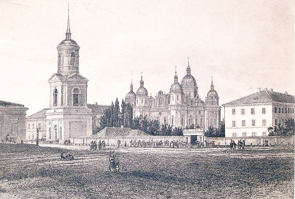 - Богоявленський собор та дзвіниця монастиря на гравюрі початку ХІХ століття