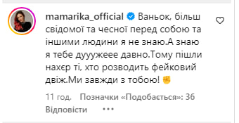 “Ваньок, більш свідомої та чесної перед собою та іншими людини я не знаю. А знаю я тебе дуже давно. Тому пішли нахєр ті, хто розводить фейковий двіж. Ми завжди з тобою”, – написала українська співачка MamaRika.