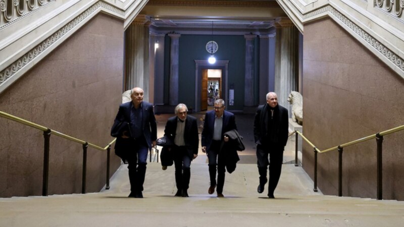 (Cправа наліво) Історики Тімоті Снайдер, Сергій Плохій, Ярослав Грицак та бізнесмен Віктор Пінчук на сходах Британського музею в Лондоні перед презентацією проєкту «Українська історія: глобальна ініціатива». 27 листопада 2023 року