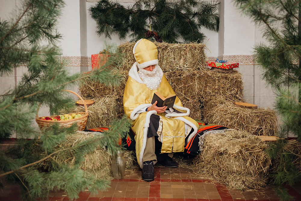 Цьогоріч резиденцію Святого Миколая у Малієвецькому маєтку графа Орловського вирішили розташувати у графській каплиці в підвалі стародавнього будинку. Резиденцію оздобили природними матеріалами: соснами, ялинами, тюками сіна та фруктами.