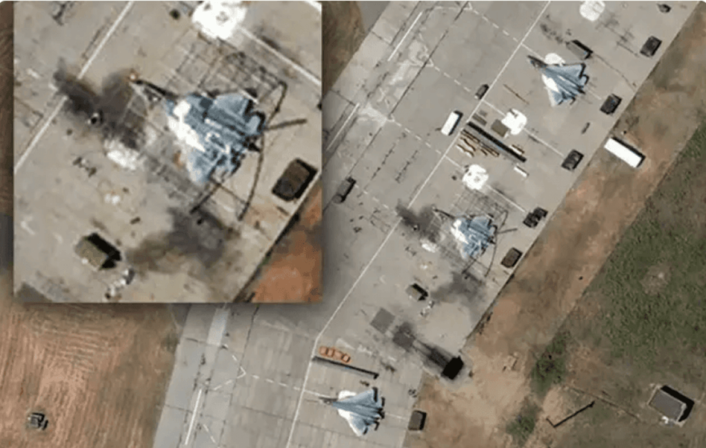 Проте вже 10 червня на знімках зображені ті ж самі літаки, які стояли на аеродромі вже після атаки 8 червня. Як і на знімку з ГУР, на ньому видно сліди горіння і невелику воронку від кабіни реактивного літака.