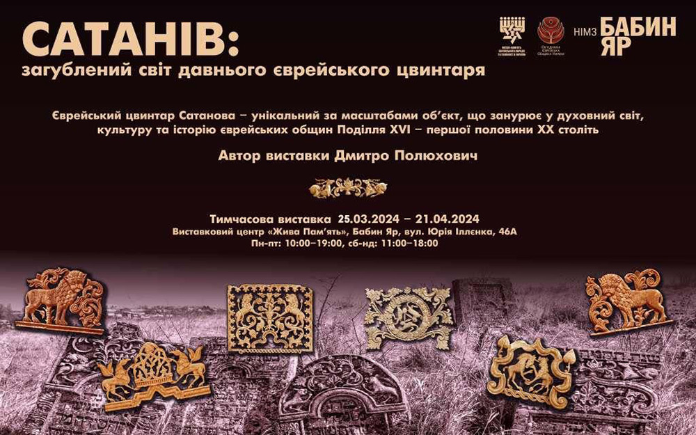 Сьогодні в Національному історико-меморіальному заповіднику «Бабин яр» відкрилася виставка «Сатанів, загублений світ давнього єврейського цвинтаря», організована Музеєм «Пам’ять єврейського народу та Голокост в Україні» (м. Дніпро) за сприяння об’єднаної єврейської общини Украни. Автор виставки – відомий подільський краєзнавець, член команди ГО «Україна Інкогніта» Дмитро Полюхович.