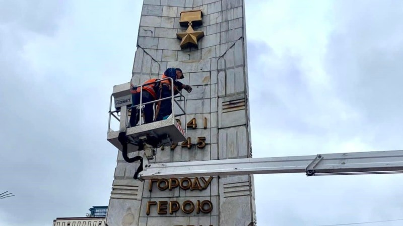 У Києві на Галицькій площі (колишня площа Перемоги) розпочали демонтаж радянської зірки з обеліску на честь міста-героя Києва.