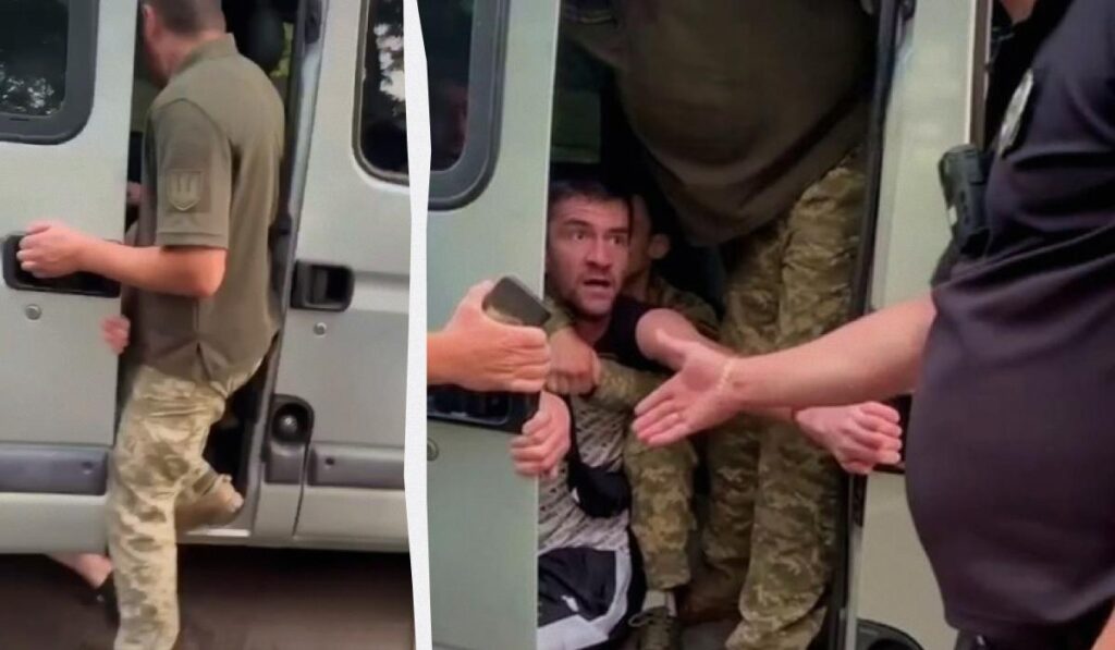 На кадрах видно, що військкоми силою його утримують та намагаються зачинити двері автомобіля, притискаючи ними ноги затриманого. Присутній на місці патрульний поліцейський у ці дії не втручається.