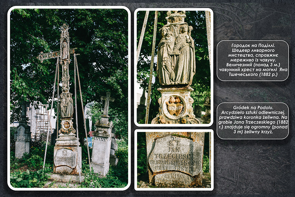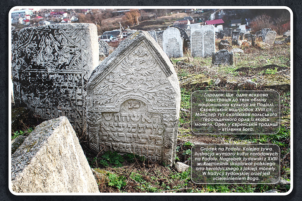 «Культури народів, які жили на Поділлі досить сильно впливали одна на одну, – каже учасник проекту від ГО «Україна Інкогніта» краєзнавець Дмитро Полюхович. – Зокрема в Сатанові на римо-католицькому цвинтарі є кілька хрестів у суто українському, православному «дизайні». Натомість на православному (українському) цвинтарі села Куманів ми знайшли надгробки оздоблені христограмою «IHS» у класичній римо-католицькій традиції. Ще цікавіше із єврейським цвинтарем у Городку. Зображення орла, який втілює Бога, сюжет досить поширений на мацевах. Але у нашому випадку майстер, який оздоблював надгробок першої половини XVIII ст., зображуючи цього птаха взяв за зразок польського геральдичного орла із якоїсь тогочасної монети. Хіба що голову повернув у протилежний бік. На цьому ж надгробку ми бачимо рослинне оздоблення запозичене із українського декоративно-вжиткового мистецтва».