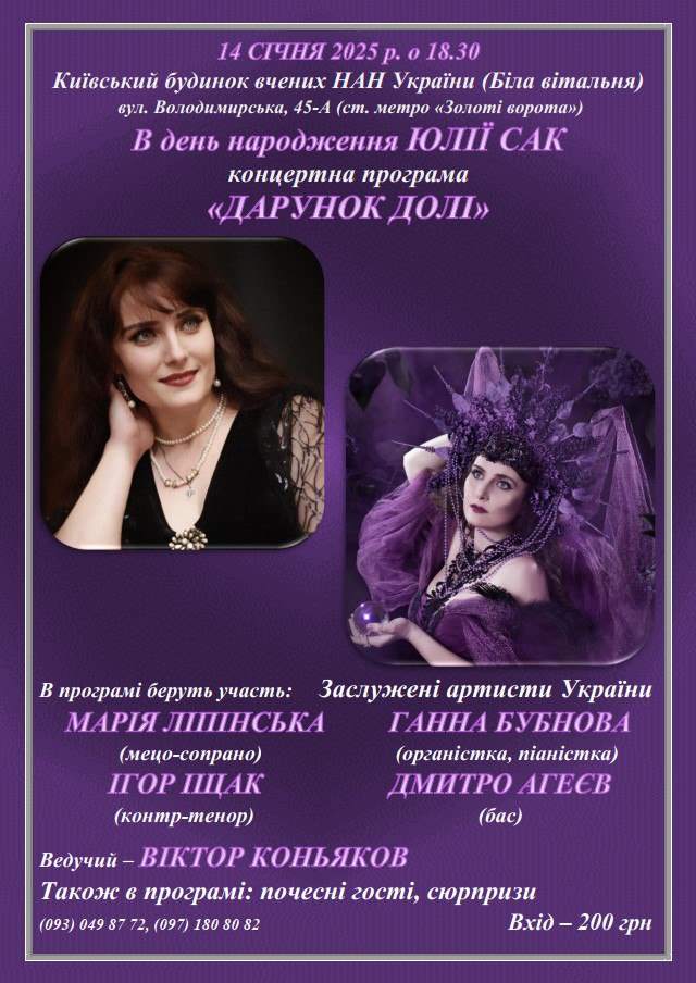 Запрошуємо всіх шанувальників мистецтва на унікальний концерт, який відбудеться з нагоди дня народження Юлії Сак – заслуженої артистки естрадного мистецтва України, актриси, кінорежисера, монтажера, художниці, поетеси та композитора.