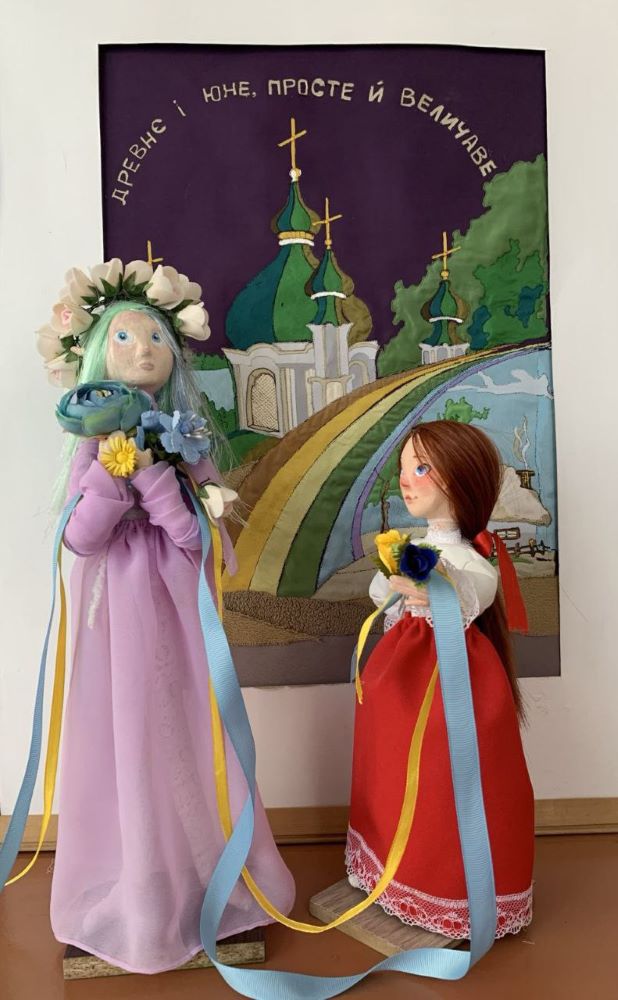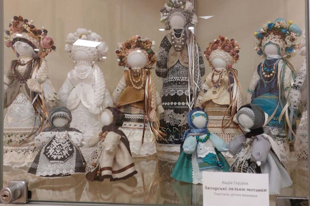 Серед експонатів – живопис, графіка, авторські вироби та елементи народного мистецтва: гердани, намиста, ляльки-мотанки, вертепна валіза з ляльками.