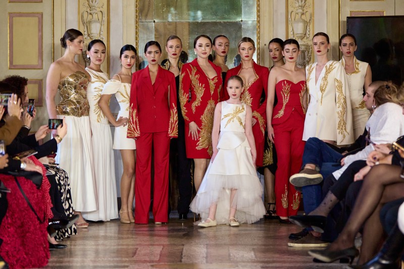 House of Rina unveiled Le Donne Di Rosso, a tribute to women everywhere — honoring their courage, resilience, and transformative power. More than a presentation of garments, the show unfolded as an emotional journey, capturing the layered nature of modern womanhood, where softness and strength exist in perfect harmony. A deliberate dialogue between shadow and fire defined the palette: deep black lace, chiffon, satin, and velvet spoke of untold stories and inner fortitude shaped by experience, while silhouettes in defiant red charmeuse, organza, georgette, and fluid silk emerged as a collective voice of visibility and solidarity. The red pulsed with life and purpose, symbolizing courage and the unbreakable bond between women who rise together. Subtle crystal and pearl embellishments highlighted the precision of couture craftsmanship, as the contrast between structured velvet and weightless chiffon mirrored vulnerability and power coexisting within a single, commanding vision.