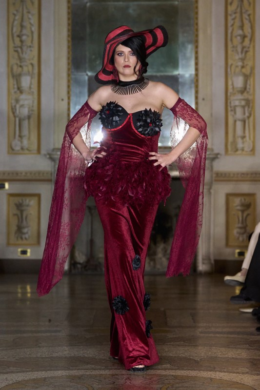 Paroma-Àla-Mode, founded by Paromita Ghosh, delivered a deeply personal couture statement where heritage, femininity, and theatrical elegance converged. Working in a dramatic palette of bordo and black, the collection unfolded through sculpted velvet silhouettes, fluid draping, and intricate surface embellishments that balanced sensuality with strength. Statement hats, corseted structures, and layered textures introduced a sense of modern vintage glamour.