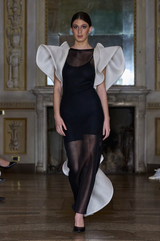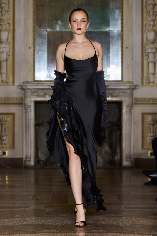 Ia Goniadze presented a vision of modern couture rooted in the philosophy of exclusivity and timeless refinement. A refined palette of muted gold and black framed the collection, while corseted waists, architectural ruffles, and sheer, weightless layers created a dialogue between structure and fluidity. Handcrafted textiles and meticulously constructed silhouettes highlighted the house’s devotion to individuality — each look existing as a singular work rather than a repeatable design. Balancing classic elegance with a distinctly modern edge, the collection embodied a quiet, confident luxury, reaffirming Ia Goniadze’s long-standing philosophy that true couture begins where uniqueness becomes absolute.