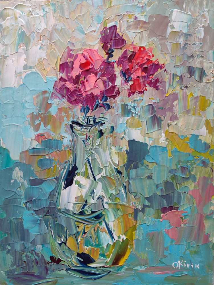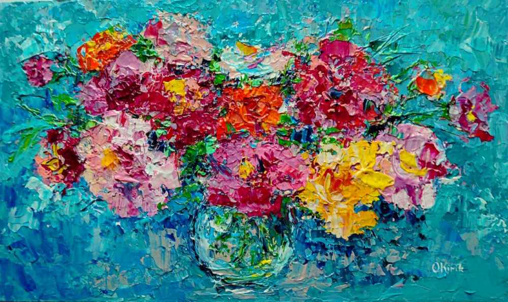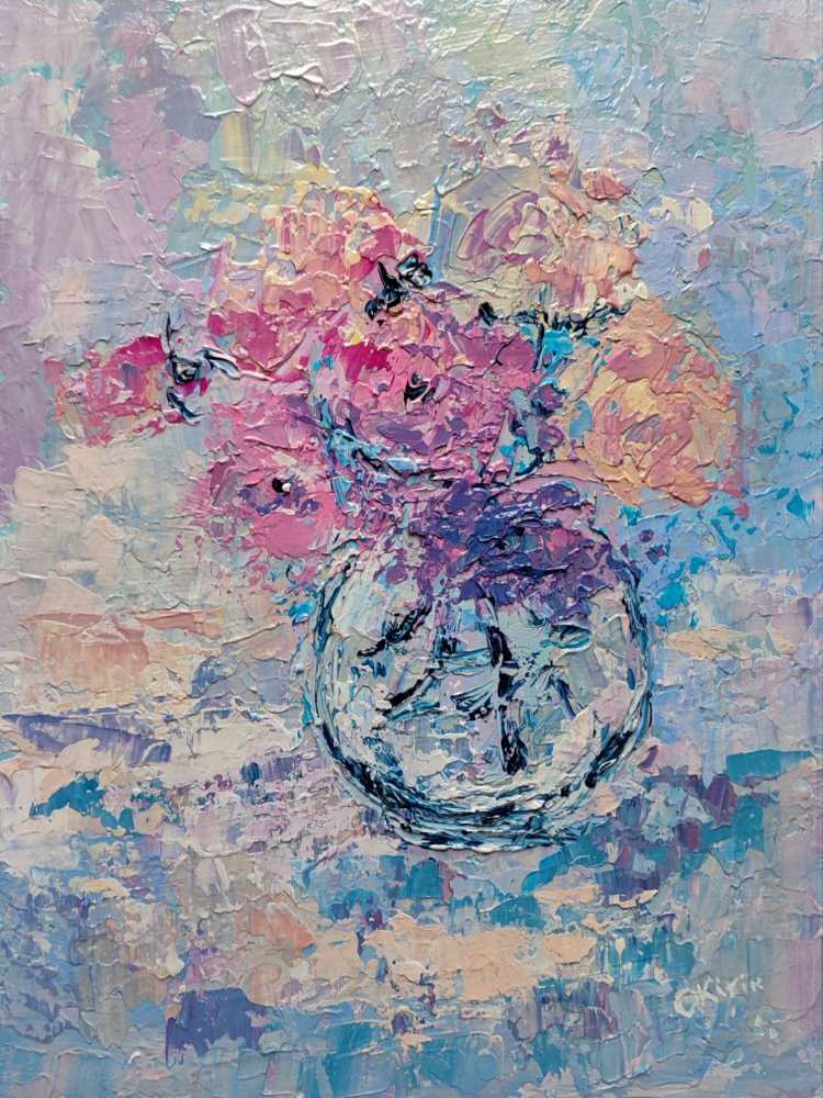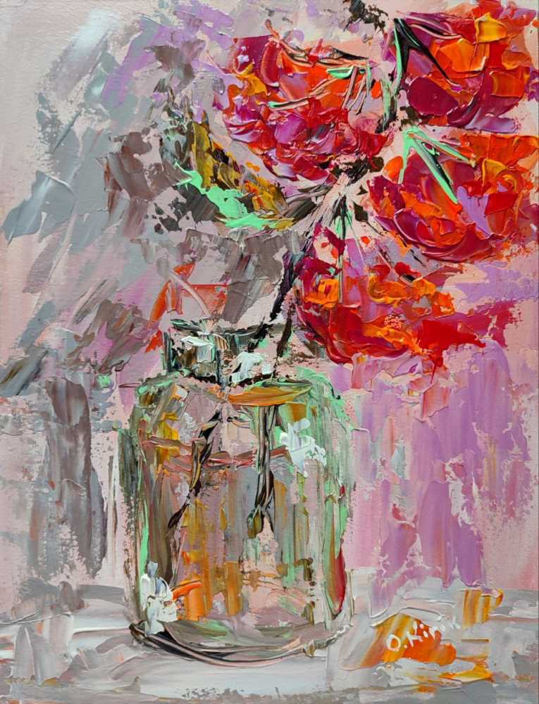 Мисткиня створює картини з квітами, пейзажами та абстракціями, але її улюбленою тематикою є букети.
